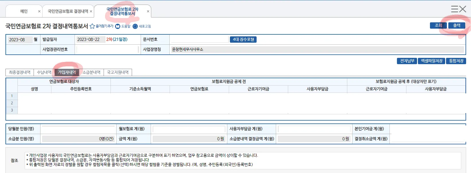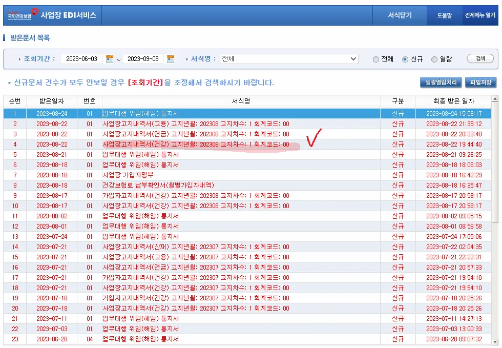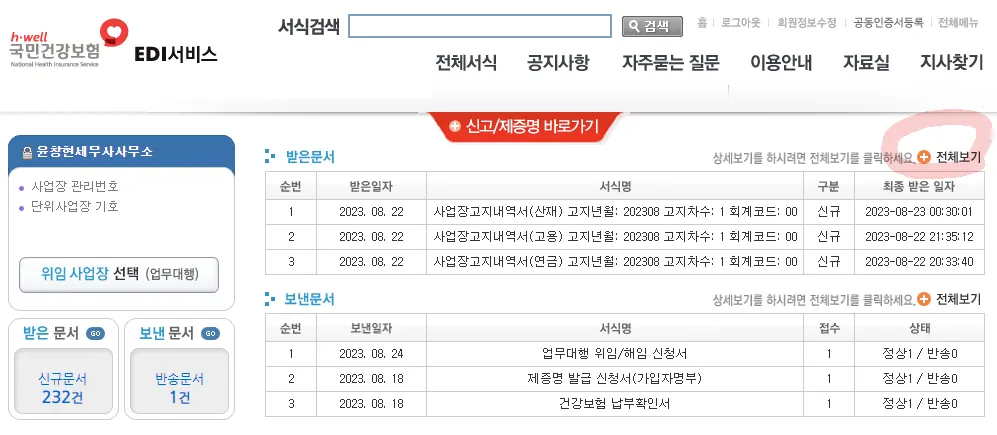 조회기간(그대로 두시면 됩니다.) → ‘전체’클릭 → 조회 월의 ‘사업장고지내역서(건강) 더블 클릭