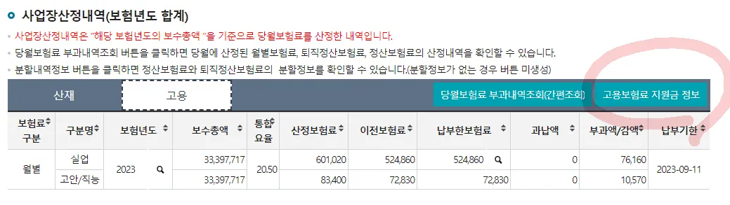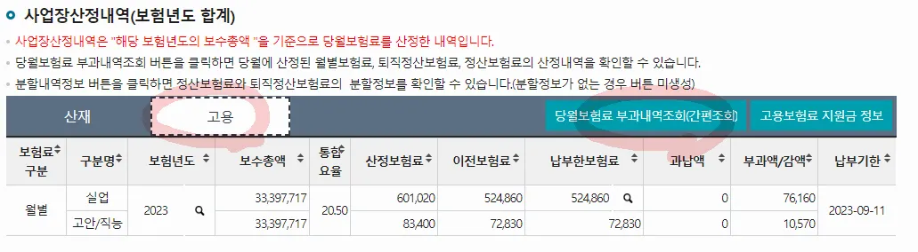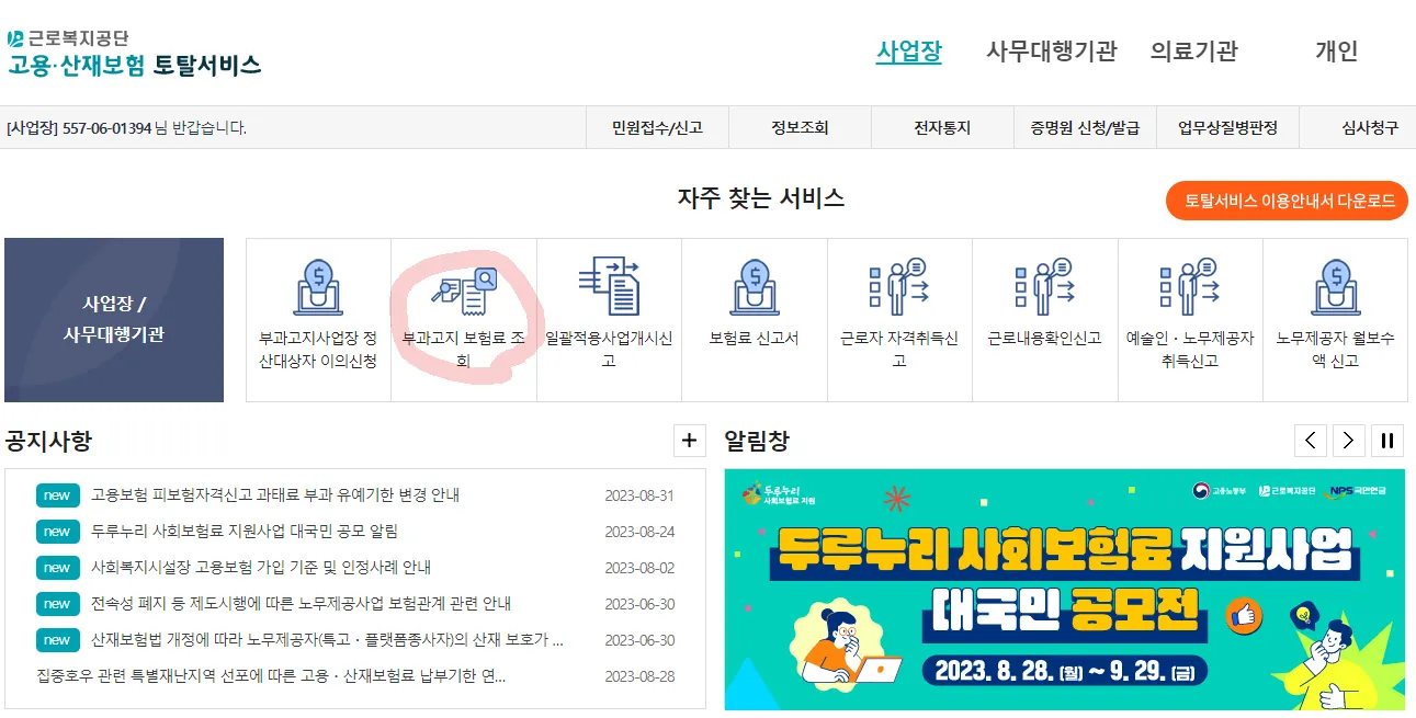 상단의’사업장’ → 부과고지 보험료 조회 클릭