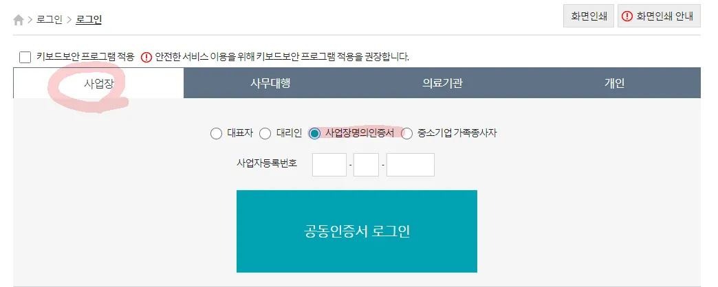 로그인 → 사업장 → 공인인증서 로그인