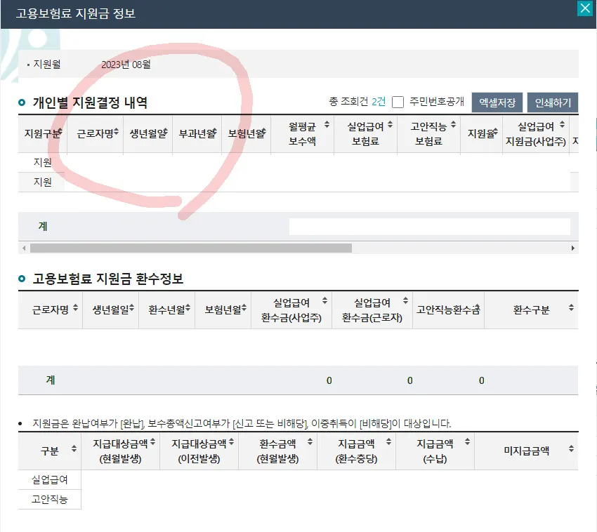 ’국고지원내역’도 클릭하여 동일하게 조회한 뒤 PDF로 저장해주면 됩니다.